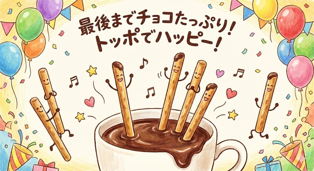 ポッキーが「最後にチョコがない部分が来る」という終焉(しゅうえん)を感じさせるのに対し、トッポは「最後の一噛みまでチョコが溢れる」というハッピーエンドを提供します。この一貫した満足感が、リピーターを離さない理由です。